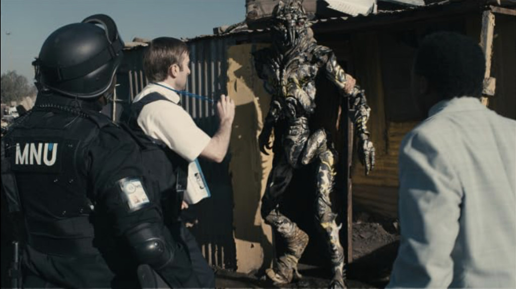 También tenemos una organización empeñada en el estudio de estos organismos, una banda criminal nigeriana que busca aprovecharse de ellos, un sanguinario ejército que anhela un pronto exterminio, y como guinda de la torta: un ineficiente, algo imbécil, aunque muy bien intencionado funcionario llamado Wikus Van De Merwe al que se le asignará como jefe de la misión de desalojo alienígena. Por aquí es que viene el motor de acción de la trama.